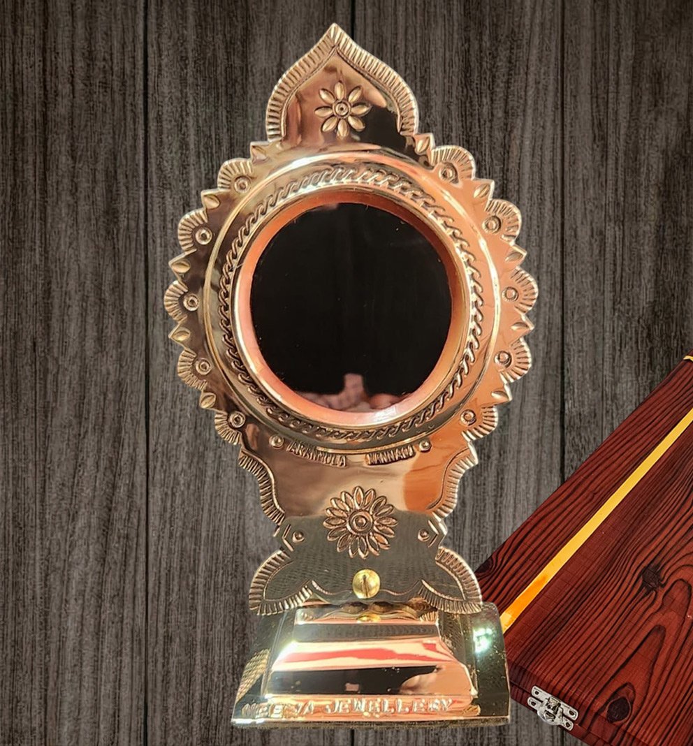 Aranmula Kannadi is a traditional handmade metal mirror from Kerala, known for its front-surface reflection (no glass). It is crafted using a secret alloy formula and is a symbol of prosperity, purity, and auspiciousness. Sourced directly from traditional artisans of Aranmula, this authentic metal mirror is crafted using a centuries-old secret alloy technique, ensuring true reflection and cultural purity.
