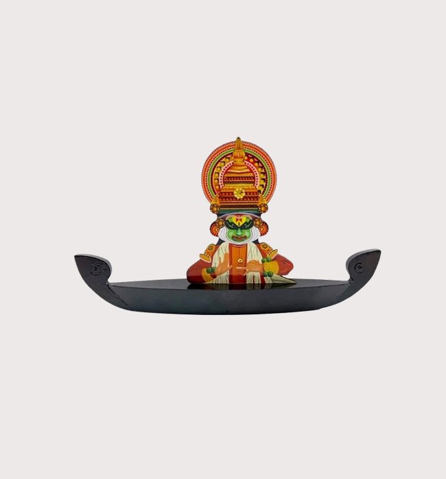 Crafted by skilled artisans, the boat showcases smooth contours and a polished wooden finish, while the Kathakali face adds a vibrant and dramatic visual appeal. This combination of craftsmanship and cultural storytelling makes it a perfect addition to your living space, office décor, or gifting collection.